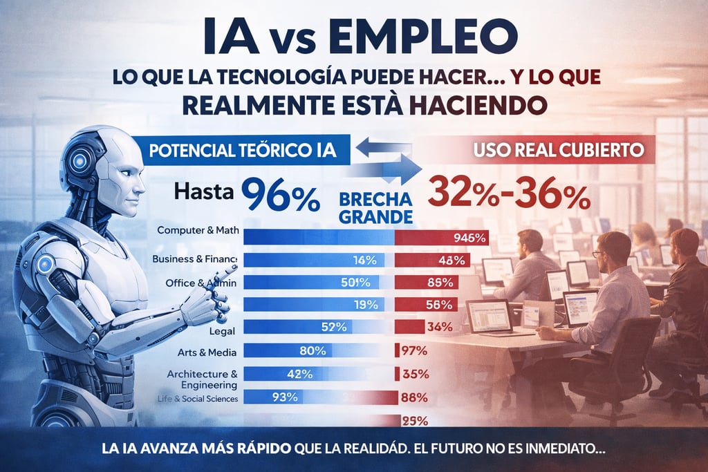 De acuerdo con la información, sectores como computación, finanzas y administración tienen una capacidad teórica de automatización de hasta el 90% o más de sus tareas, pero en la práctica la adopción real se mantiene muy por debajo, en rangos que van entre el 25% y 40%. Esto indica que, aunque la tecnología ya existe, su implementación aún es limitada.